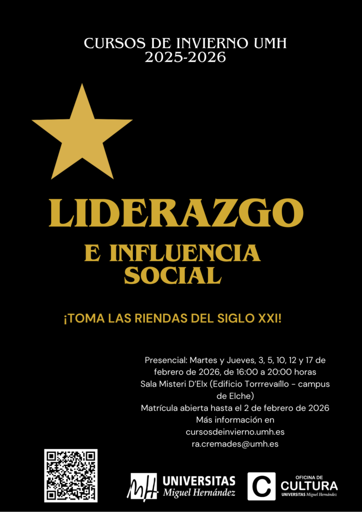 El curso de Liderazgo e influencia social tendrá lugar los Martes, 3, 10 y 17 de febrero, así como los jueves, 5 y 12 de febrero, de 16 a 20 horas en el campus de Elche.